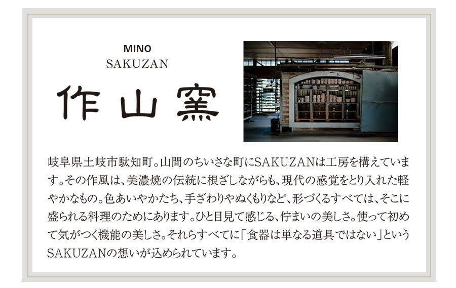 SAKUZAN has a workshop in Toki City, Gifu Prefecture, the production area of Mino ware. Tableware is created that incorporates the tradition of Mino ware and modern sensibilities.