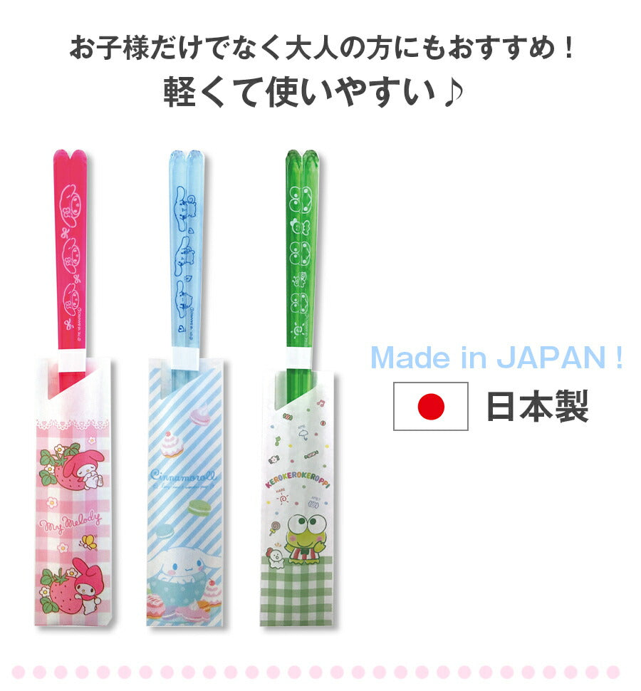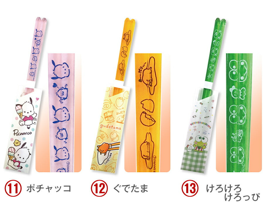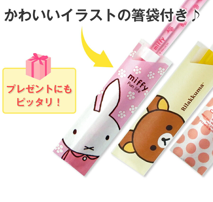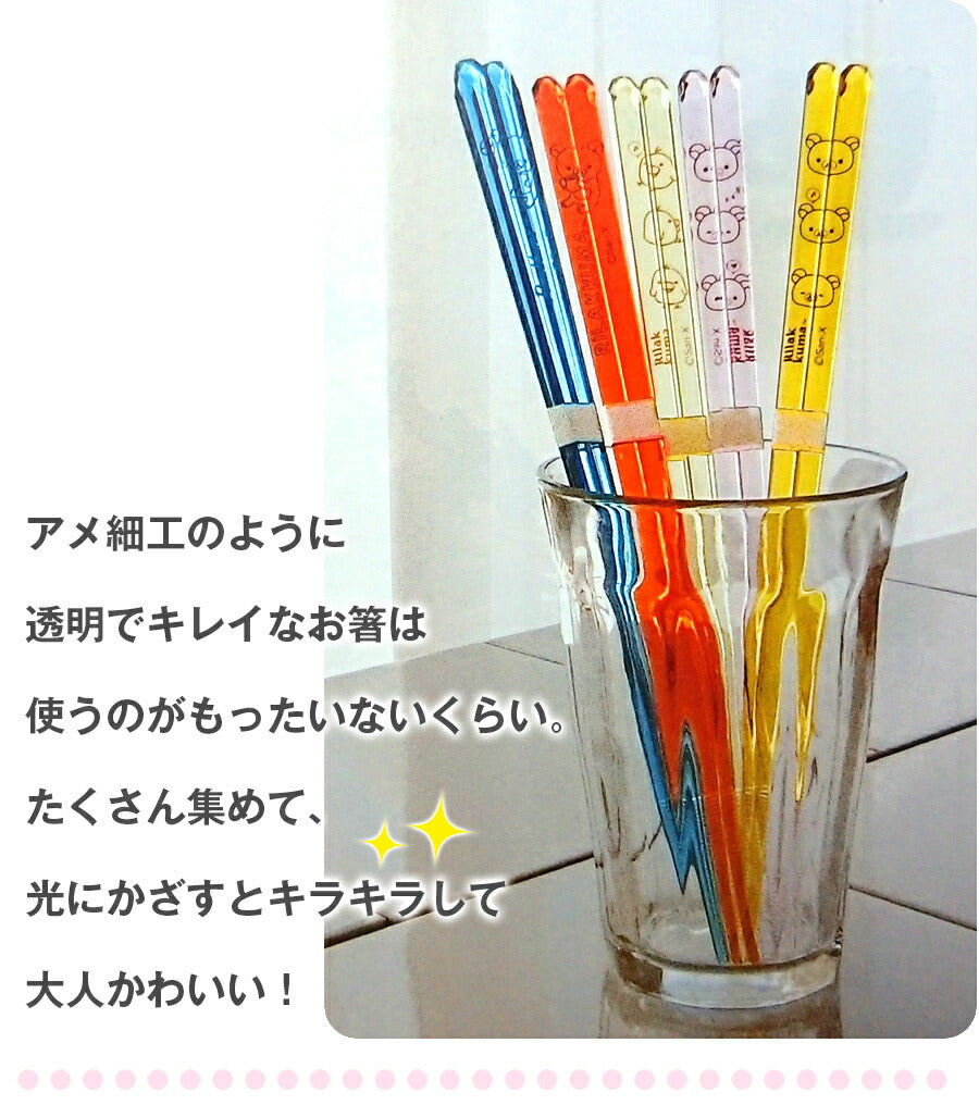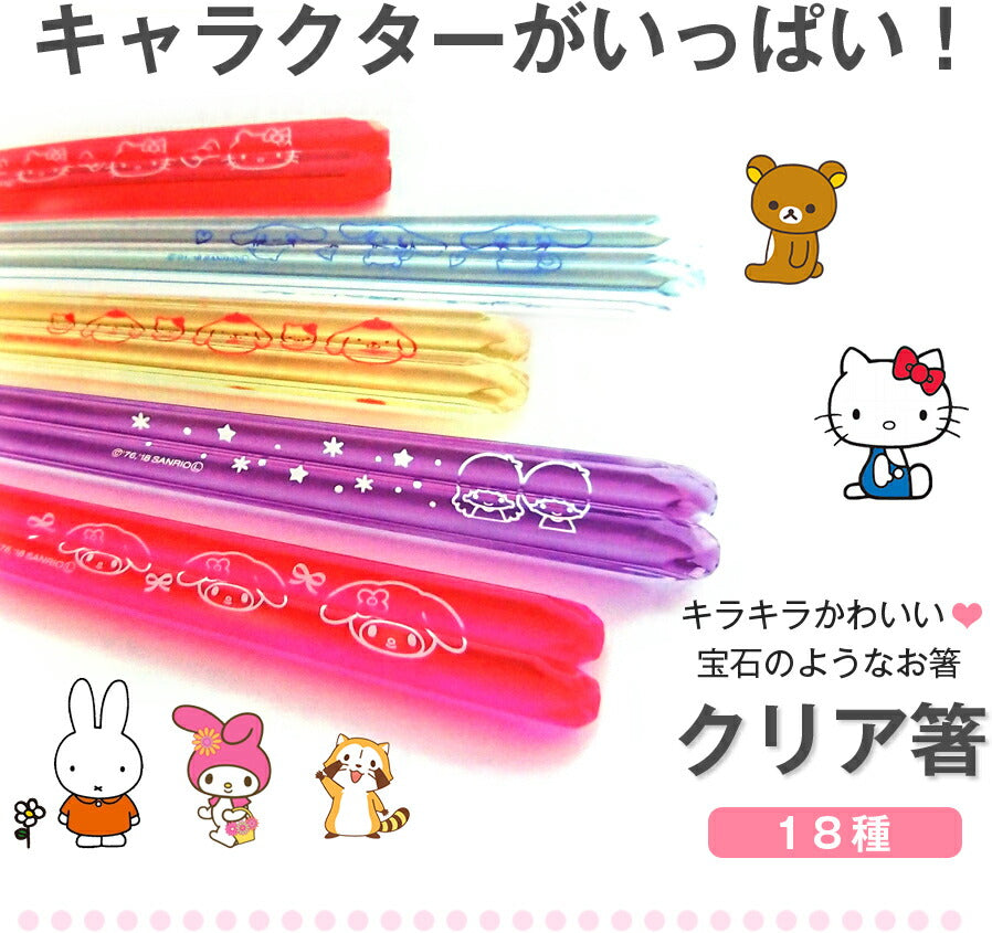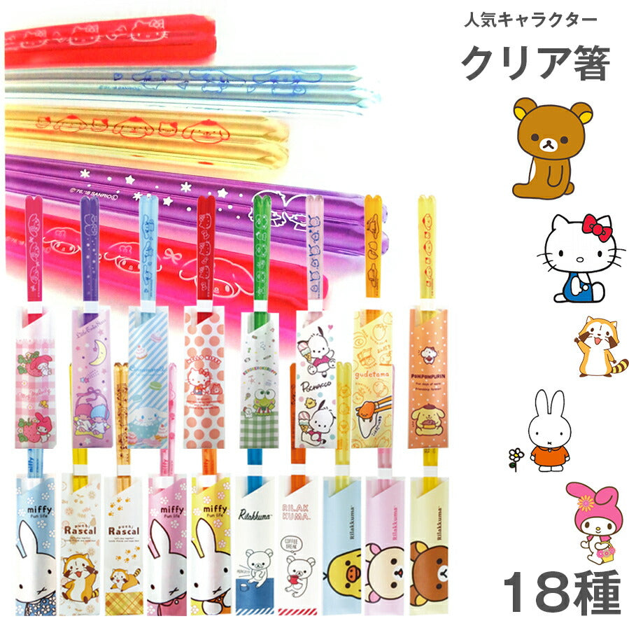 【クリア箸(リラックマ/サンリオ/ミッフィー/ラスカル)】カラフルでポップな透明のお箸が登場!キャラクターのかわいい箸袋付きで全部揃えたくなっちゃうかわいさです。食洗機が使用できて使い勝手も○です。たくさんのキャラクターの中からお選びいただけるので、お気に入りのキャラクターのお箸がきっと見つかると思います。お箸の種類は、・リラックマ5種(コリラックマやキイロイトリ)・サンリオ8種(ハローキティ・マイメロディ・シナモロール・キキララ・ぐでたま・けろけろけろっぴ・ポムポムプリン・ポチャッコ)・ミッフィー3種・ラスカル2種★(1)〜(18)番のリラックマ・サンリオ・ミッフィー・ラスカルのお箸はこちらの商品ページへ→ ★(19)〜(38)番のスヌーピー・ドラえもん・ポケモンのお箸はこちらの商品ページへ→ お友達やご家族へのプレゼントやギフトにいかがでしょうか。
