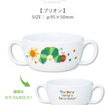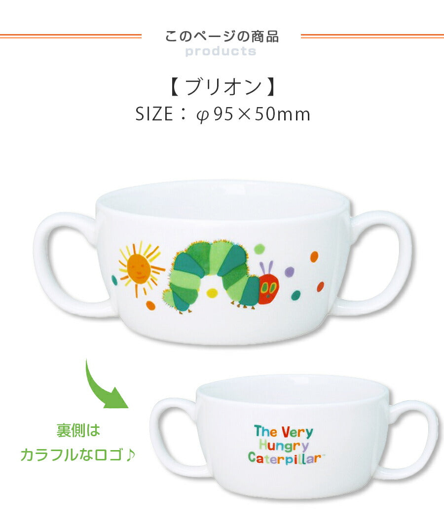 【はらぺこあおむし・ブリオン】〜はらぺこあおむしの食器シリーズ〜世界中で愛読されるエリック・カールのベストセラーしかけ絵本「はらぺこあおむし」が楽しい食器として登場しました!子供の頃に絵本を読んだ事のあるママたちに大人気のキャラクターです。男の子・女の子どちらにも気に入っていただける、絵本の物語がデザインされたカラフルでたのしい食器となっています。また、機能的には食洗機対応・電子レンジ対応で、使い勝手も◎です。毎日のように使う物なので、国産というのもうれしいポイントですね。このページの商品は、ブリオンです。お子様が両手で持ちやすい形状です。持ち手があるので、スープやおかずなどをお子様が自分で食べやすい食器となっています。裏側にはカラフルなロゴが描かれていてかわいいですね!はらぺこあおむしはお子様だけでなくママにも大人気。プレゼントにもとても喜ばれます。ブリオンだけでなく、同シリーズのマグカップやカトラリーなどもありますので、ご一緒にいかがでしょうか。食卓が楽しくなりますよ♪〜はらぺこあおむしのシリーズ一覧〜・こども茶碗・こどもマグ・フルーツ皿・ランチプレート・ラーメン丼・レンゲ・カレー皿・ブリオン・スプーンM/フォークM・塗汁椀M・塗箸S・こども食器ギフトセット お友達やご家族へのプレゼントやギフトにいかがでしょうか。