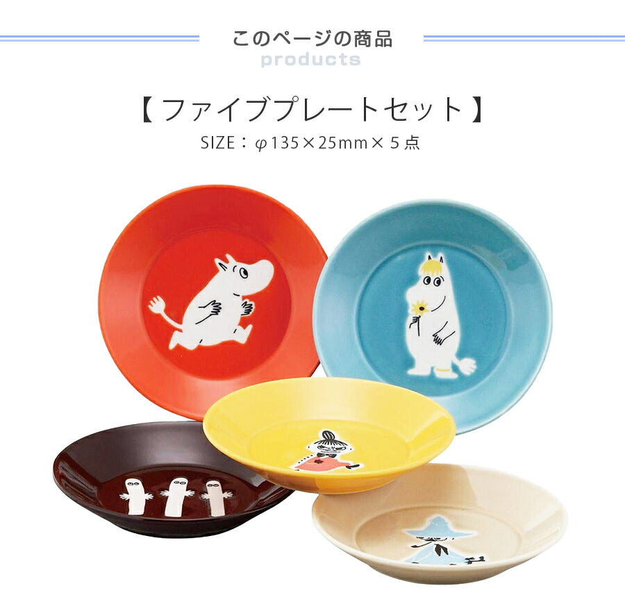 ムーミンと仲間たちが、カラフルな色合いのお皿に描かれたお皿の5点セットです。